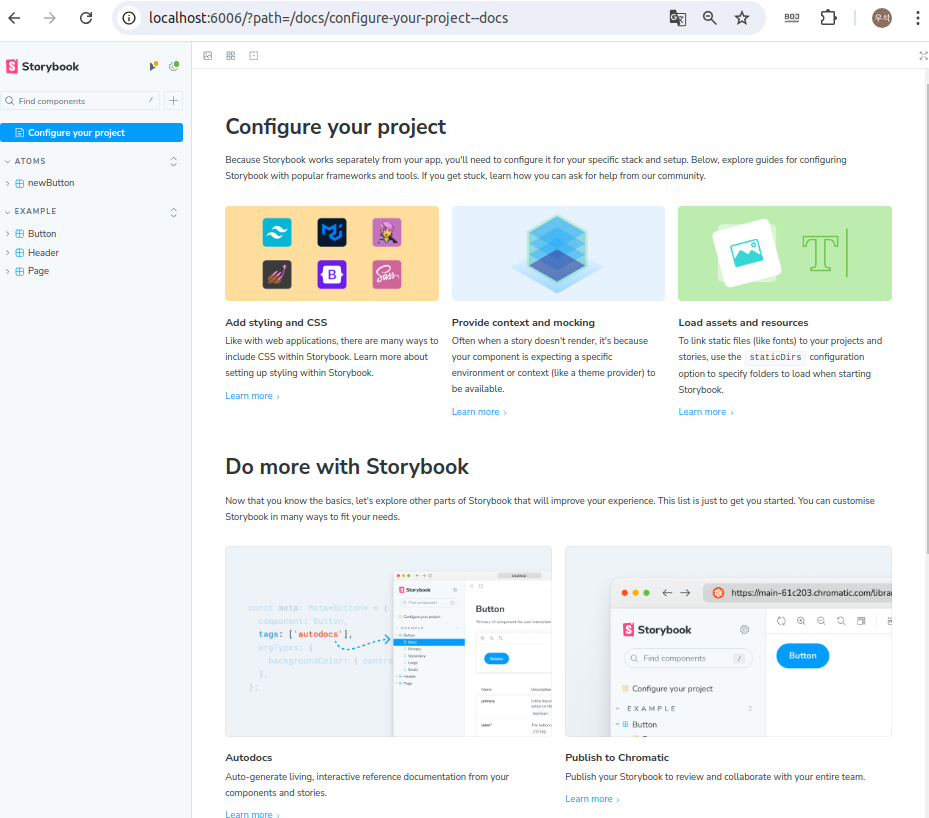 이 이후에 npm run storybook 을 입력하면 어떠한 창이 뜨게되는데 이것이 스토리 북 입니다.