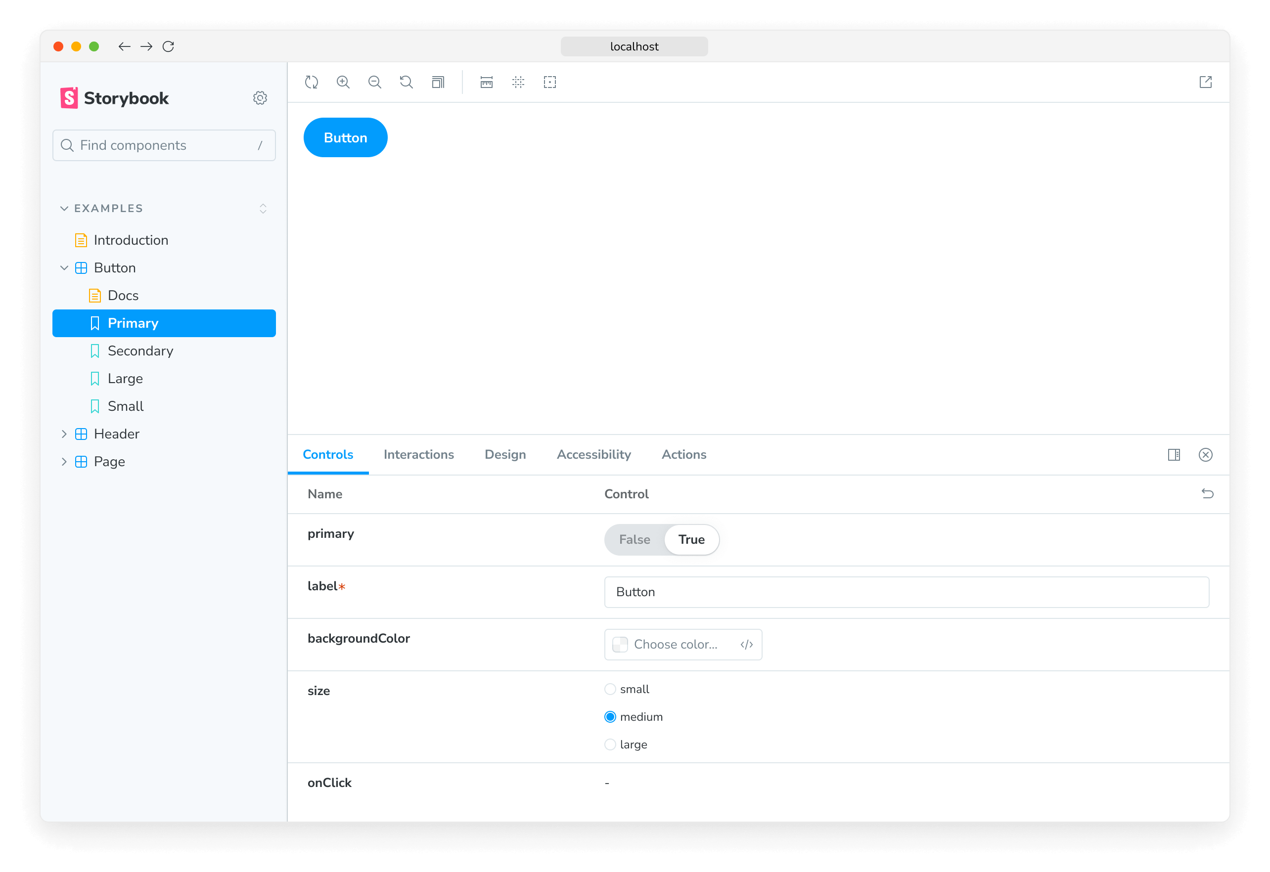각 예제 컴포넌트에는 지원하는 상태를 보여주는 스토리 세트가 있습니다. UI에서 스토리를 탐색하고 . 으로 끝나는 파일에서 스토리 뒤에 있는 코드를 볼 수 있습니다. .stories.js 스토리는 컴포넌트 예제를 작성하기 위한 ES6모듈 기반 표준인 Component Story Format(CSF)으로 작성됩니다.